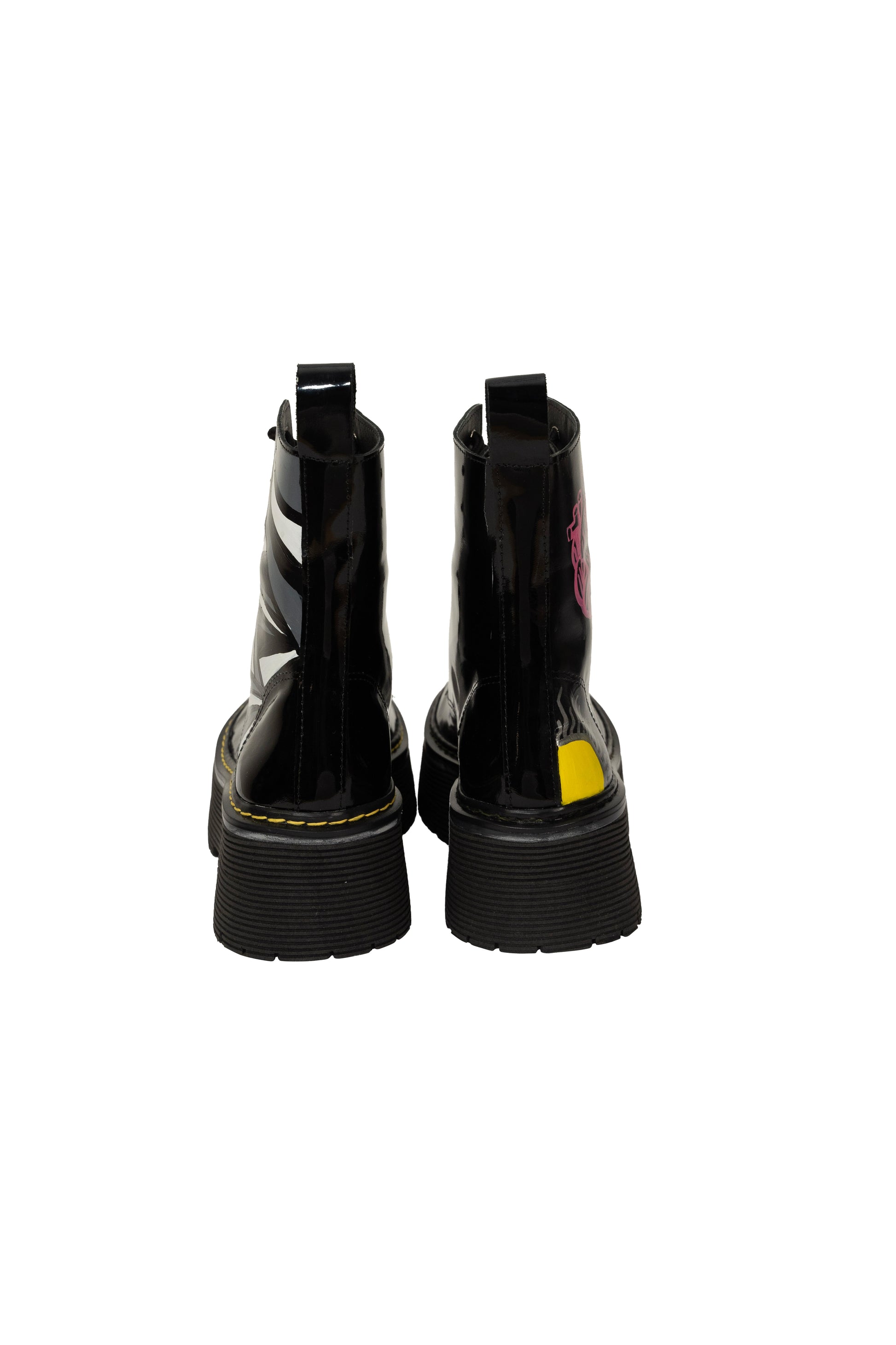 The Rock black vegan leather combat boots are perfect for adding an edgy touch to your festival wardrobe. Featuring a glossy crocodile-textured finish and chunky platform sole, they combine bold style with comfort. The lace-up design with metal eyelets offers a secure fit, while the yellow stitching adds a pop of color. Pair these boots with a flowy dress or denim shorts for a striking contrast, making them ideal for festivals, concerts, or any casual summer outing where you want to stand out while staying cruelty-free. They are simply the perfect lace-up to wear year round!